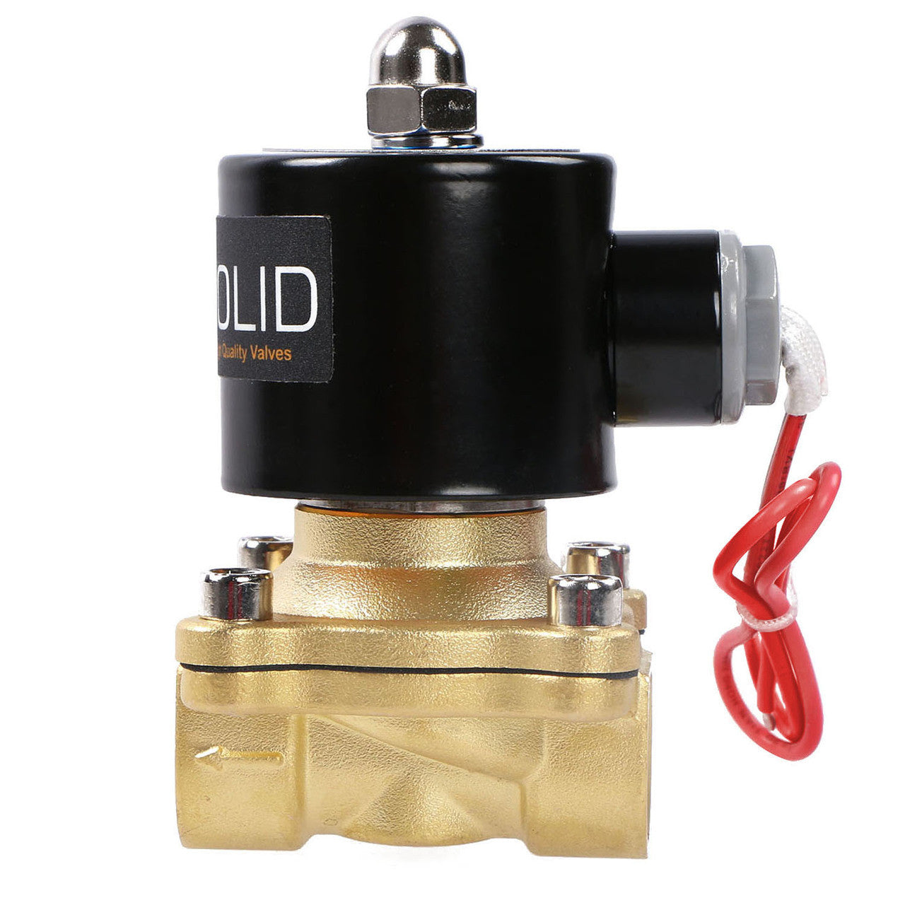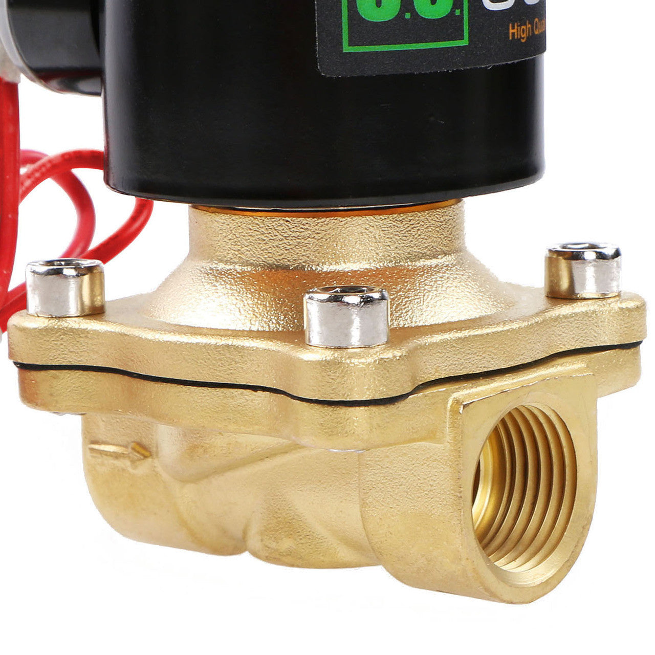 U.S. Solid normally closed (N/C) electric solenoid valve is constructed with a durable brass body, 1/2" female threaded (G) connections, and strong VITON gasket.