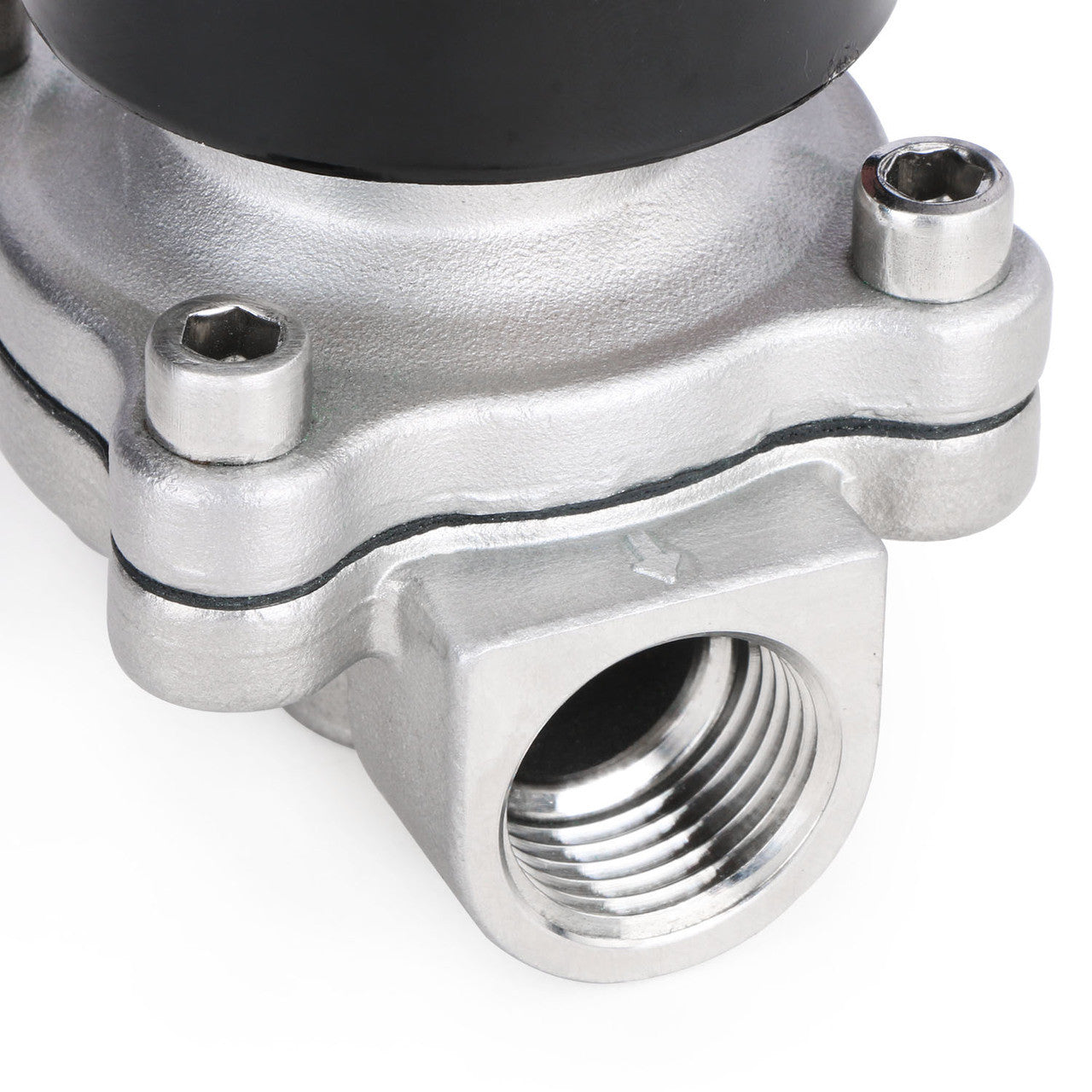 U. S. Solid normally closed (N/C) electric solenoid valve is constructed with a high-quality stainless steel body, two-way inlet and outlet ports with three-quarter inch (3/4") female threaded (G) connections, and heat and oil resistant Viton gasket. Suitable for use with hot or cold water, gas, air, very low viscosity fluids (< 20 cst), oils and hydrocarbons, e.g., gasoline, kerosene, or diesel fuel. Suitable for outdoor use. Not for use underwater. Customers chose this general purpose valve for: do-it-yourself projects, moderate temperature applications, harsh chemicals, flow control for irrigation systems, reverse osmosis systems, or to control flow of propane gas.