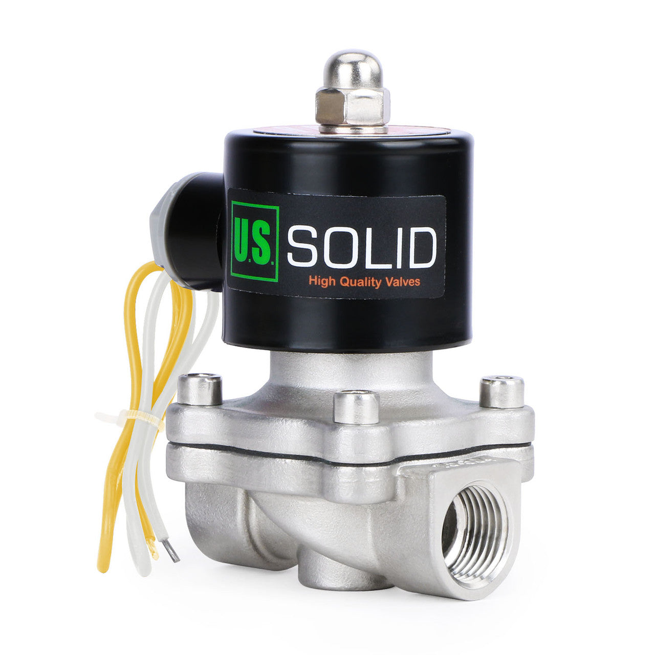 U.S. Solid normally closed (N/C) electric solenoid valve is constructed with a Stainless Steel body, 3/4" female threaded (G) connections, and strong VITON gasket.